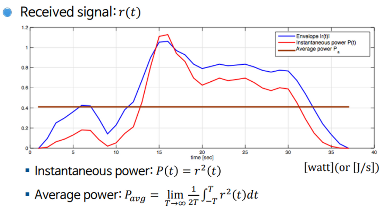 위 그림에서 파란색 선은 $|r(t)|$로, received signal $r(t)$의 envelope를 나타낸다. 빨간색 선은 $r(t)$ Instantaneous power로, 매 시간 환경들이 변화됨에 따라 값이 출렁이는 것을 볼 수 있다.