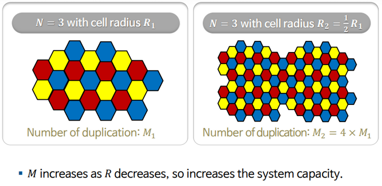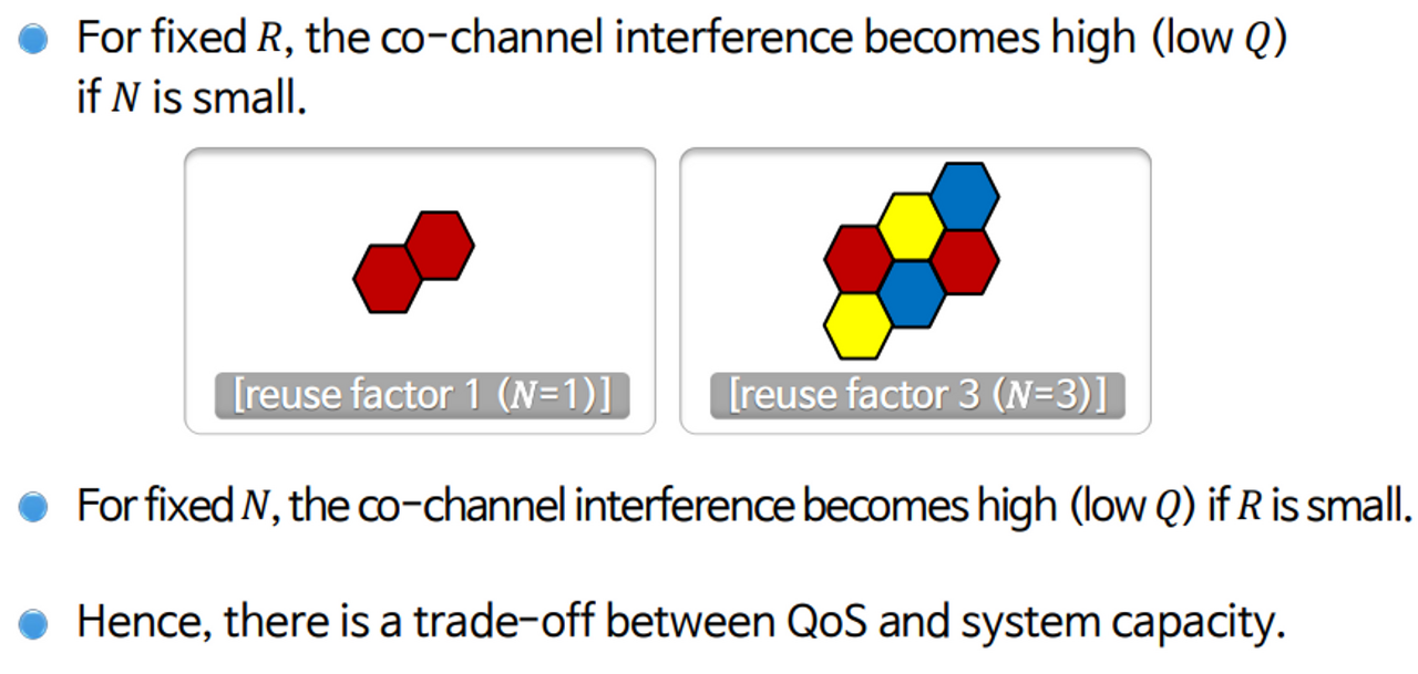 즉, $N$값을 작게 설정할수록 frequency reuse 횟수가 증가하여 Capacity도 증가한다. 하지만 $N$값이 작아질수록 같은 BW를 사용하는 cell간 거리가 가까워져 Co-channel interference가 증가한다.