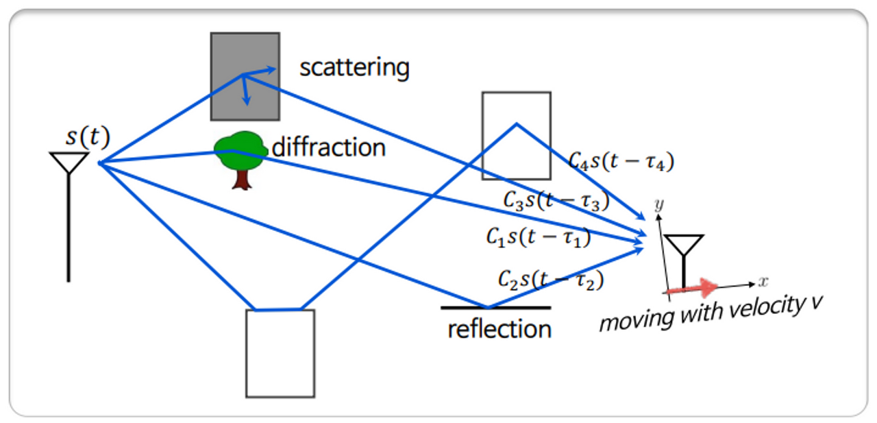 더하여 Rx는 mobile 기기이므로, Rx가 움직일 때는 반사된 신호들이 모두 변형되어 도착하므로 원본 신호 $s(t)$를 복원하기가 더 어려워진다.