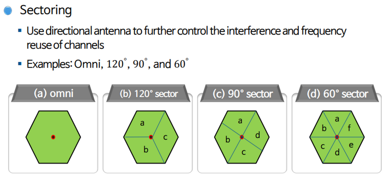 Omni directional antenna는 x-y평면을 기준으로 360도로 power를 전파하는 안테나이다. 이 안테나의 전파 영역을 120도, 90도, 60도로 분할(Sectoring)하여 frequency reuse를 증가시킬 수 있다.