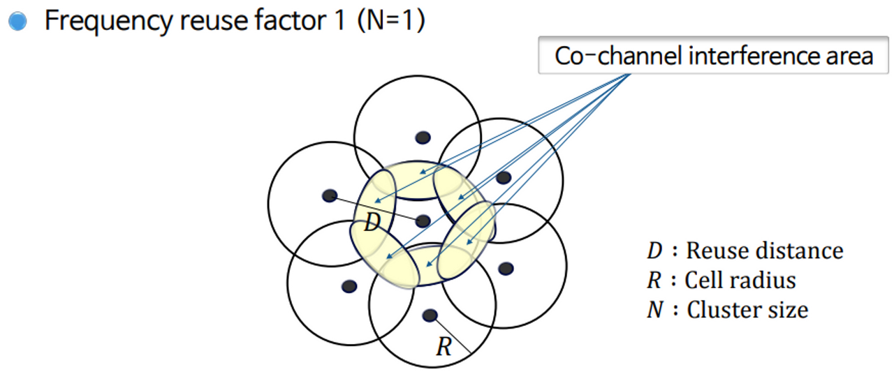 - 같은 BW를 사용하는 인접 cell간 중심거리 $D$ : Reuse distance