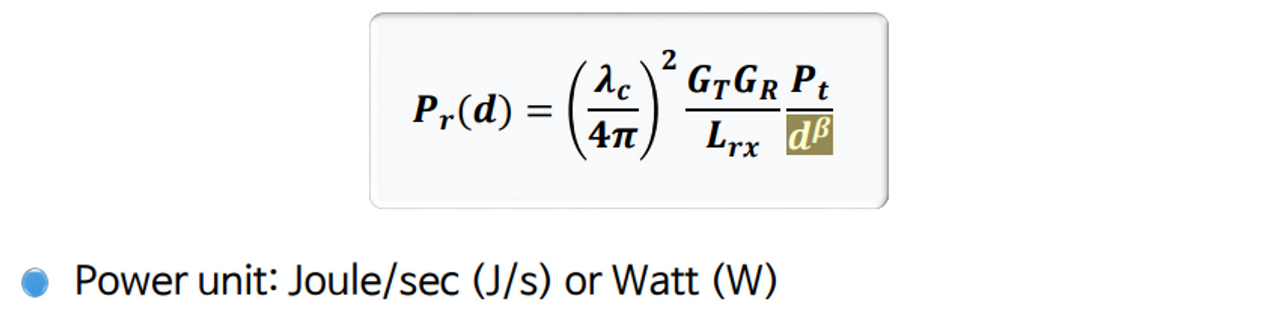 - Path loss : 거리에 따라 power가 얼마나 줄어들 것인지를 나타낸다.