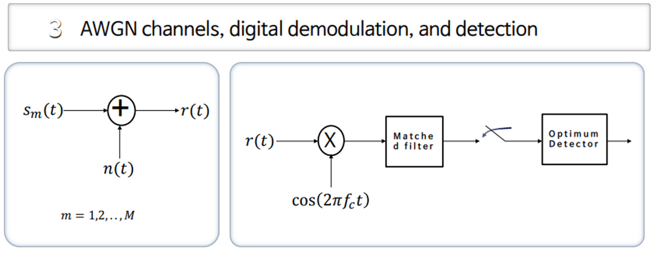 Rx에는 원본신호에 noise가 추가된 수신신호 $r(t)$를 받게 되는데, 이를 Matched filter를 거친 후 Optimum detector를 이용하여 error를 최소화하여 optimal한 결정을 내린다.