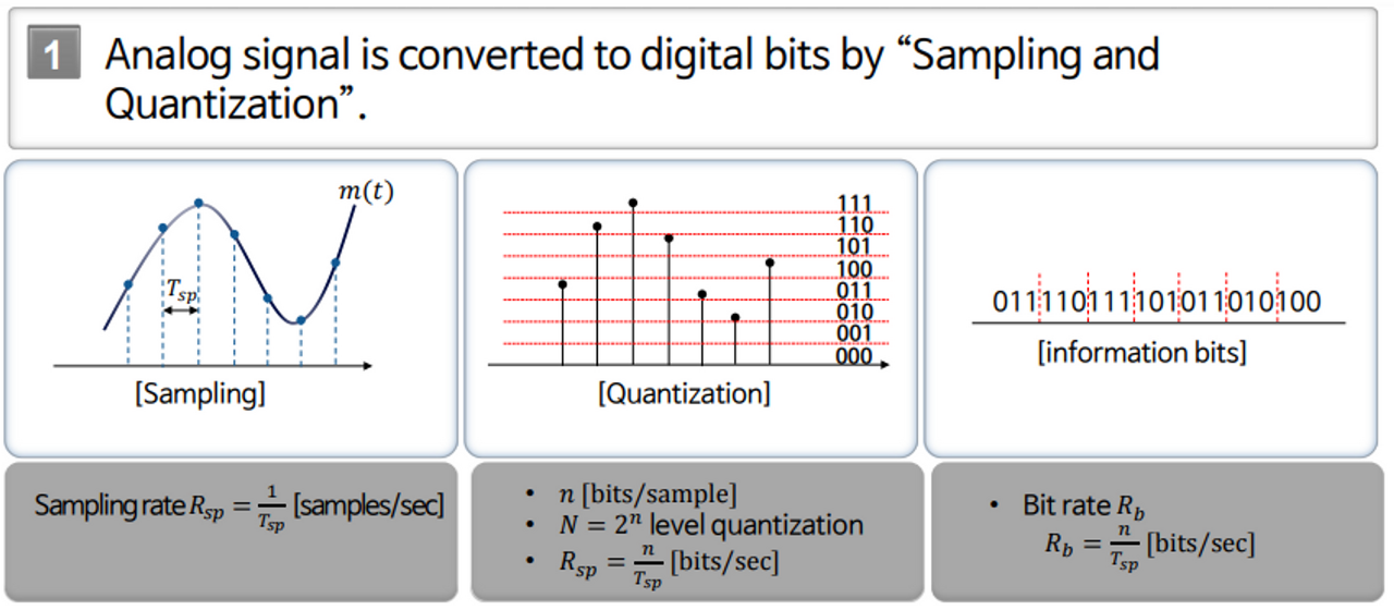 - Quantization 된 signal를 amplitude를 구간별로 나눠 bits 단위로 encoding 한다. Rx에서 원본신호의 bits를 완벽하게 복원할 수 있다면 Received signal은 원본 신호와 동일한 정보를 갖고 있다고 말할 수 있다. (Quantization noise 제외)