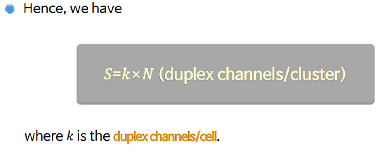 따라서 한 cluster당 총 Duplex channel 개수 $S$는 cluster size $N$에 한 cell당 사용하는 duplex channel 수 $k4를 곱한 것과 같다. Cluster size $N$ : 한 cluster에 존재하는 cell 개수