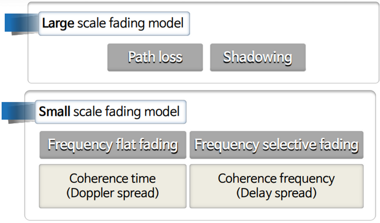 - Rx가 시간에 따라 계속 움직이는 경우 Time domain에서 diffraction, reflection, scattering의 영향이 계속 바뀌어 channel 또한 바뀌게 된다. 매 시간 간격동안 channel이 Time domain에서 빠르게 변화한다면 fast fading이라고 말하고, channel이 거의 일정하다면 slow fading이라고 말한다.