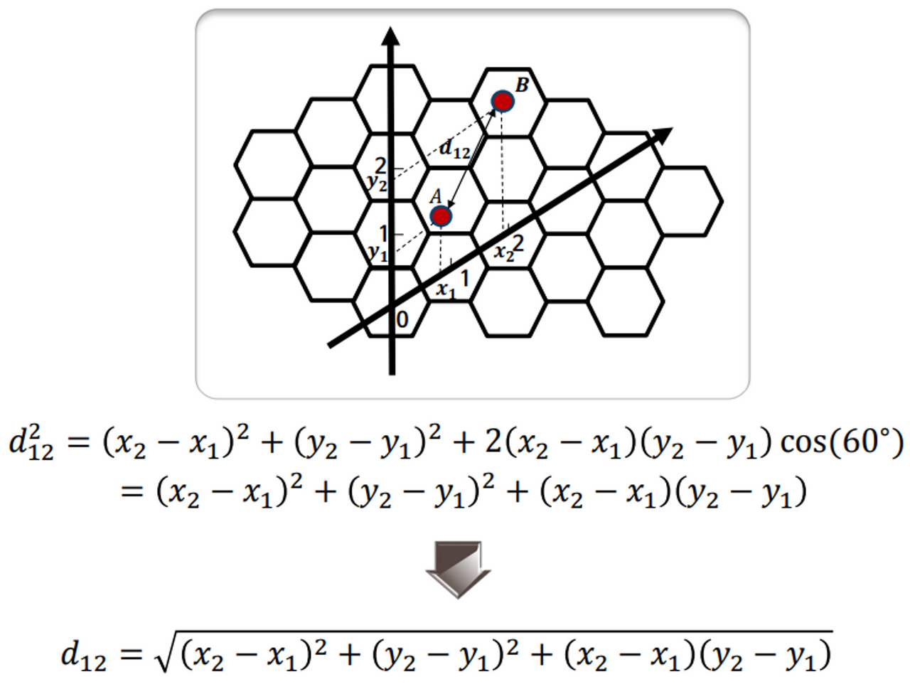 $d_{12}=\sqrt{3}R\sqrt{(x_2-x_1)^2+(y_2-y_1)^2+(x_2-x_1)(y_2-y_1)}$