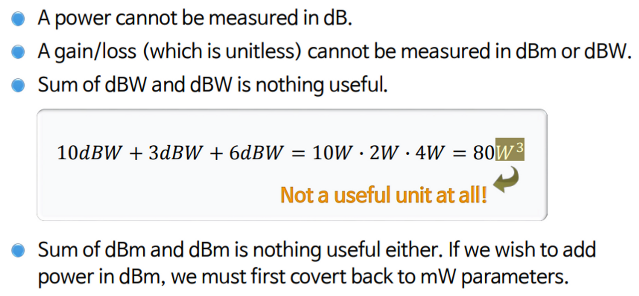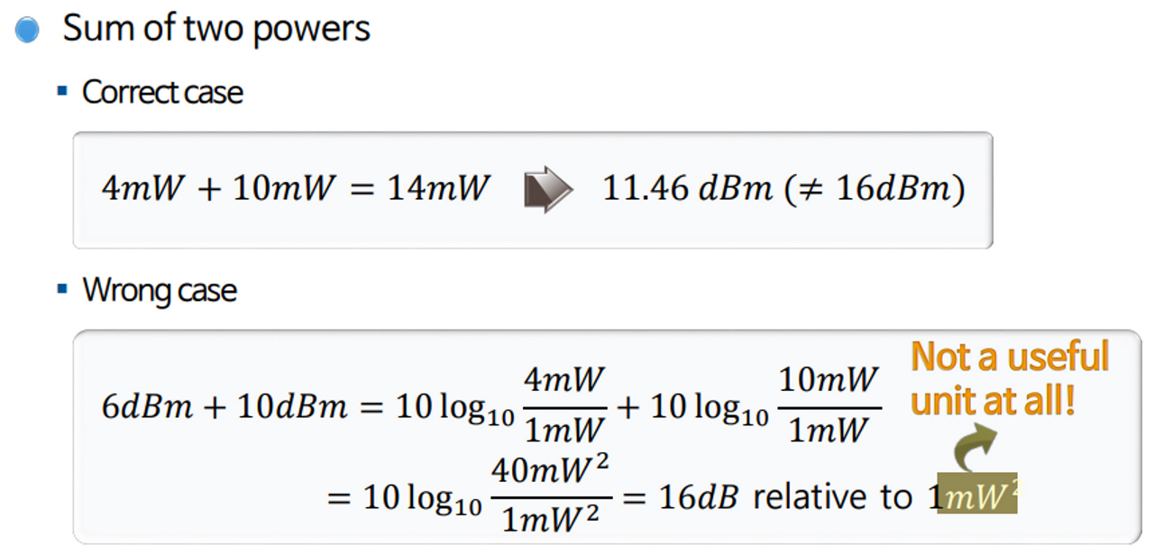 $mW$는 unit이 존재하기 때문에 서로 더할 수 있다. 하지만 $dBm$으로 변환한 후 그 둘을 더하면 log연산을 더하는 것이므로 전혀 다른 값이 도출된다. (mW에 log라는 비선형 연산을 거친 결과가 dBm이므로 mW에서의 덧셈이 dBm에서의 덧셈과 같을 수가 없다. dB와 dBW에서도 다 마찬가지임)