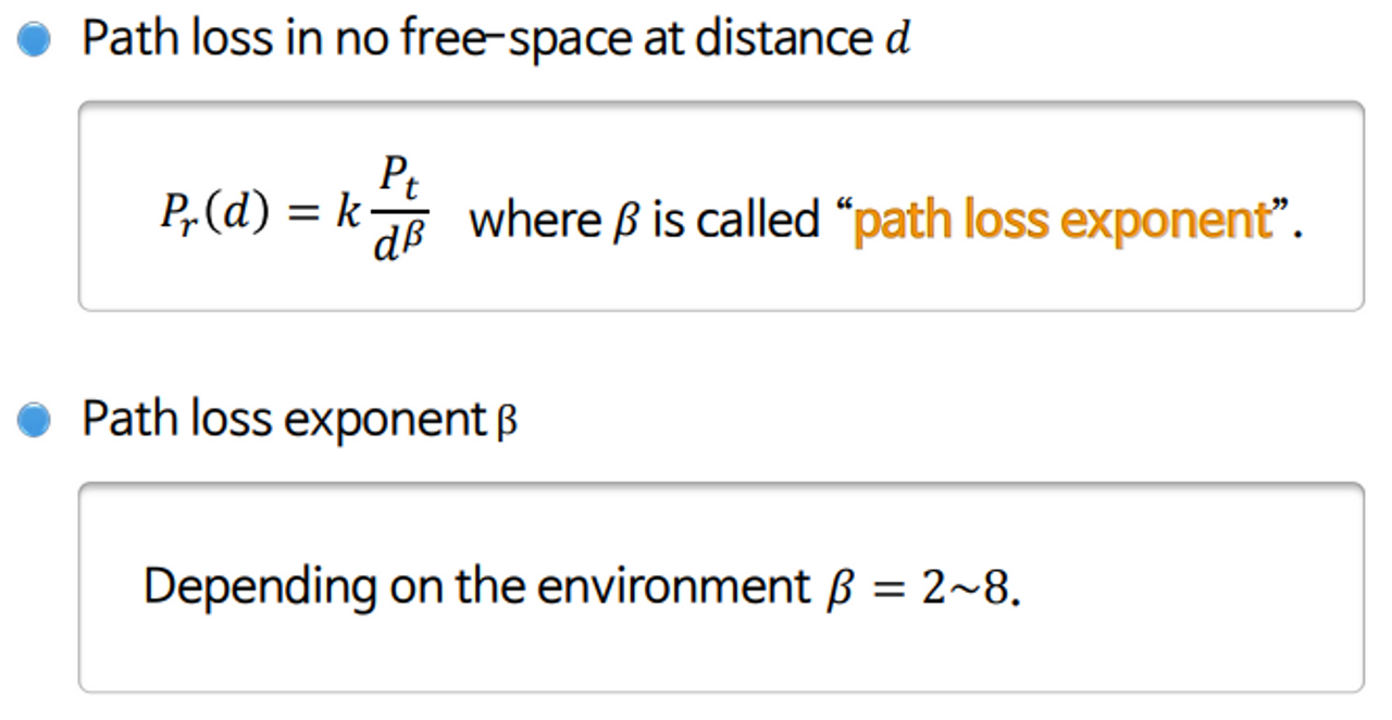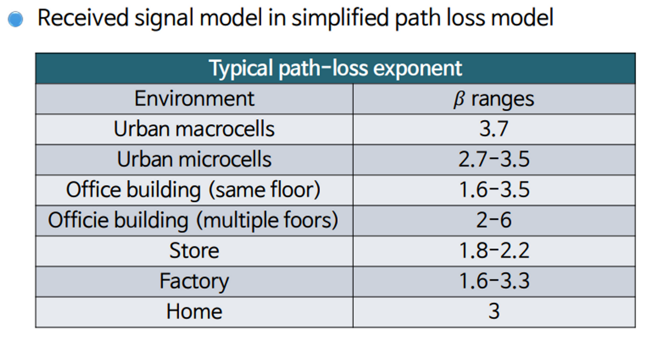 Path loss exponent $\beta$는 Free space에서는 $\beta=2$로 정의되지만 실제 환경에서는 2~8의 값을 가질 수 있다.