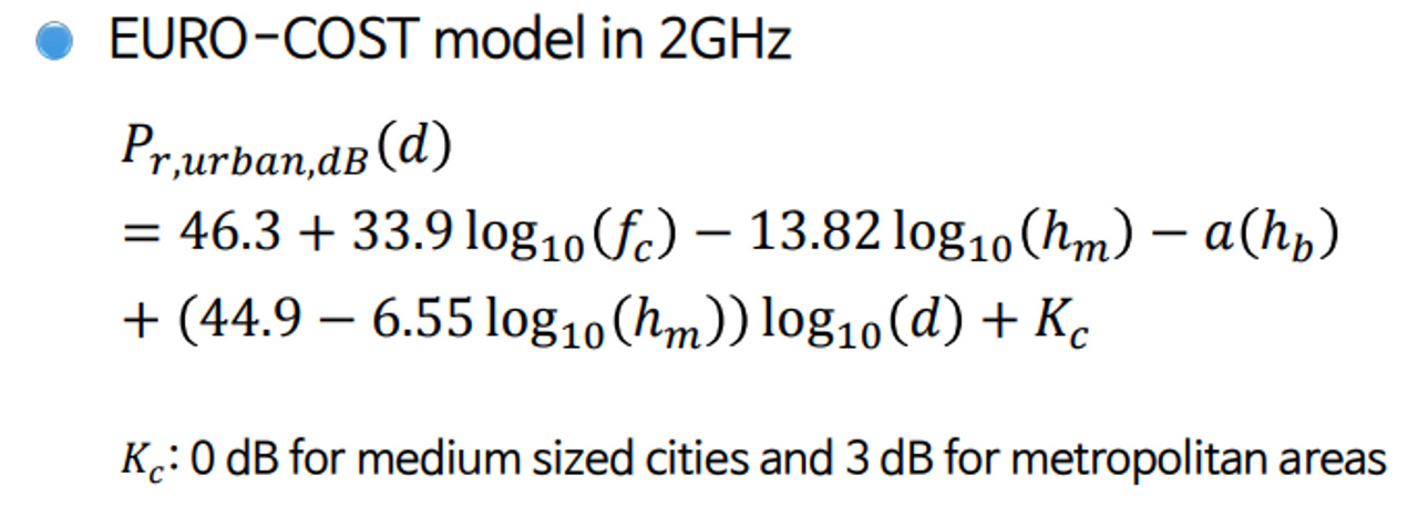 Hata model을 확장하여 유럽에서 사용하는 Cost model의 경우 Path loss model은 위처럼 정의된다.
