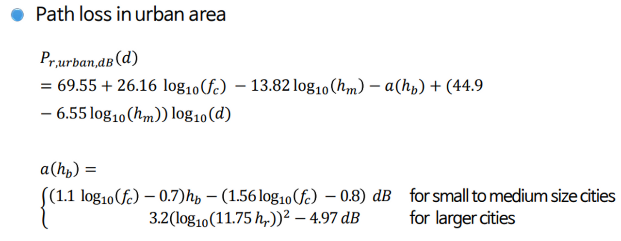 Hata model을 Urban에서 사용하였을 때 Path loss는 위처럼 정의된다.