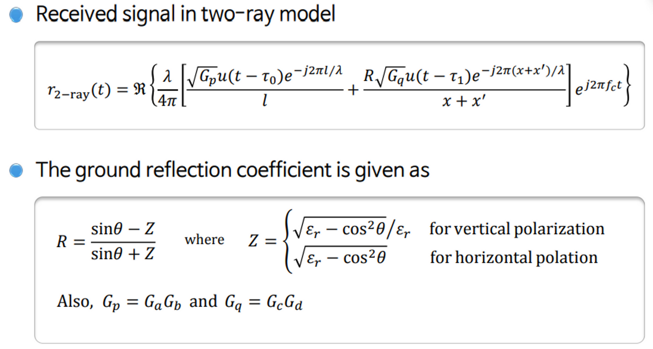 - Two-ray model : 2개의 경로를 고려하며, distance의 4제곱에 따라 power가 감소한다. (Two-ray 유도식을 확장하여 three, four 혹은 더 높은 차수의 다중-ray model을 얻을 수 있다.)