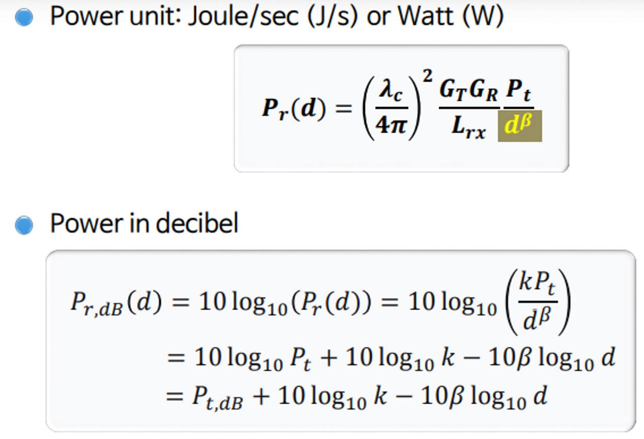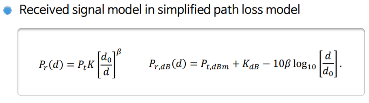 앞선 강의에서는 Received power $P_r(d)=(\frac{\lambda_c}{4 \pi})^2 \frac{G_T G_T}{L_{rx}} \frac{P_t}{d^\beta}[W]$로 정의했었다. 여기서 $(\frac{\lambda_c}{4 \pi})^2 \frac{G_T G_R}{L_{rx}}=k$로 두면 $k \frac{P_t}{d^\beta}$를 얻는다.
