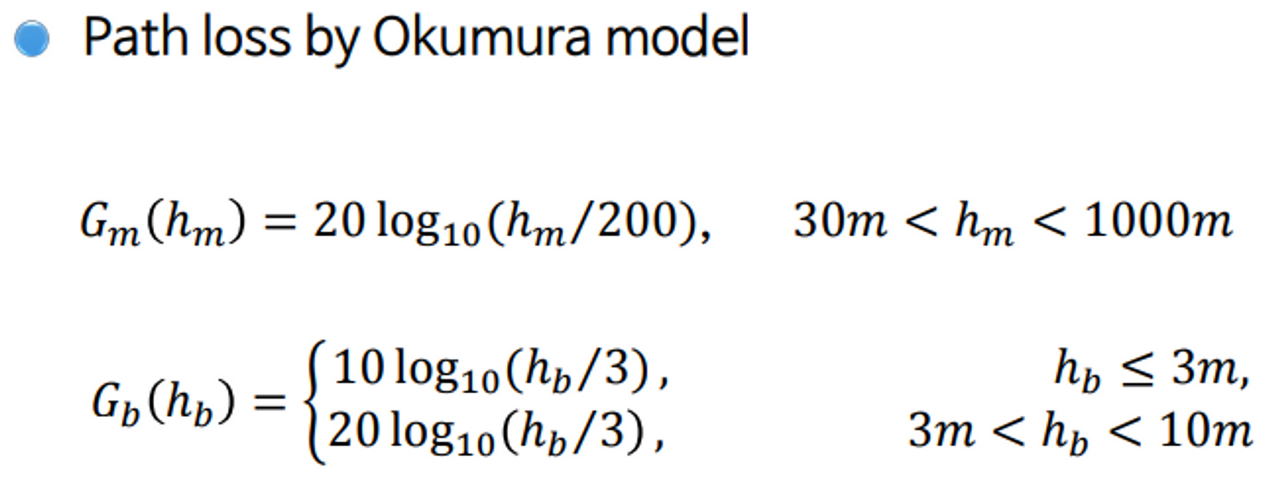 Okumura model에서는 Mobile (Rx) antenna의 높이에 따른 이득 $G_m(h_m)$과 Base station (Tx) antenna의 높이에 따른 이득 $G_b(h_b)$를 위와 같이 정의한다.