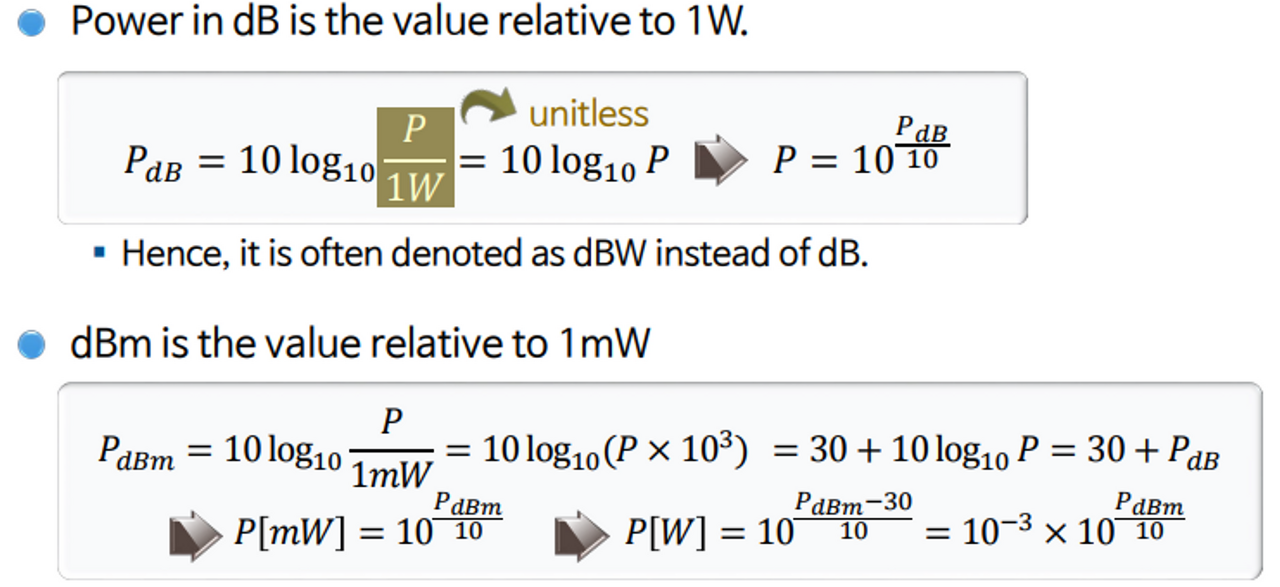 - Power는 dB, dBm으로 측정되는 것이 아니라, dB, dBm을 이용하여 표현하는 것이다. (dB는 단위가 아니라 표현 수단이다.)