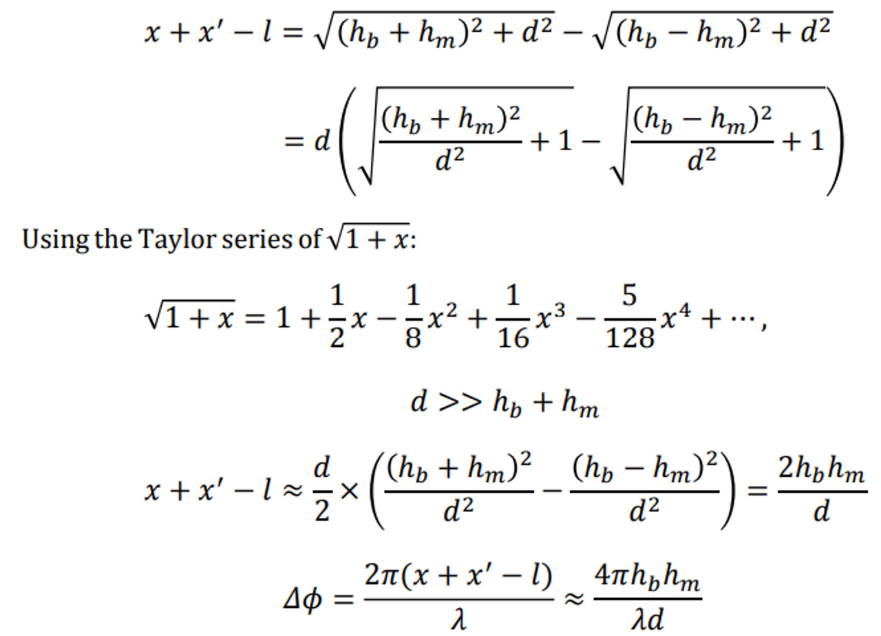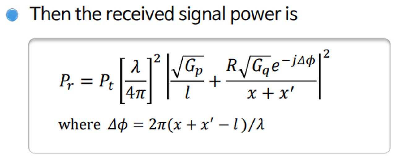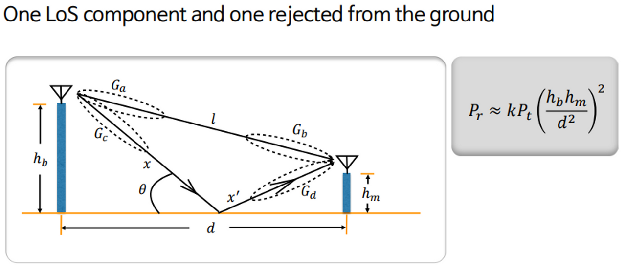 이처럼 LOS와 한 번 부딪혀서 오는 Non-LOS를 함께 고려하는 path loss를 two-ray path loss model이라고 부르는데 실제로 이 모델이 많은 경우에 상당히 정확하게 작동하므로, 이 모델을 자주 사용한다.