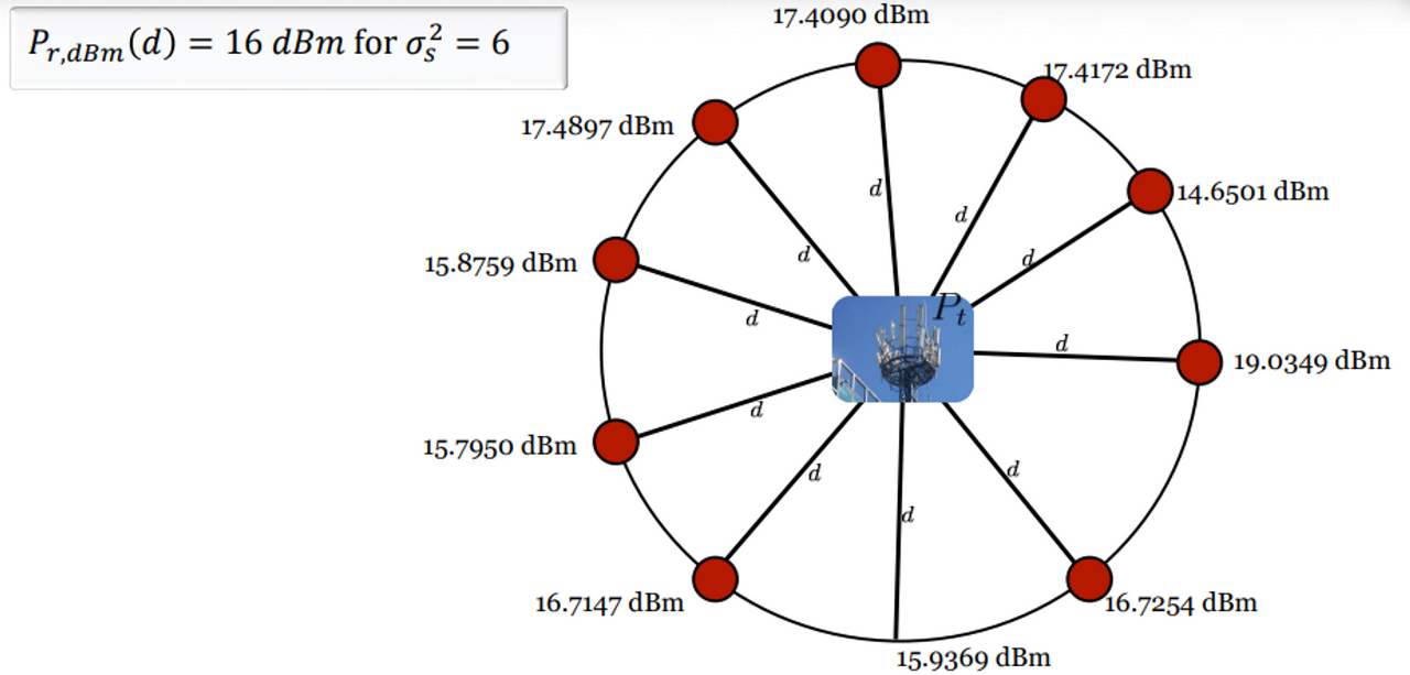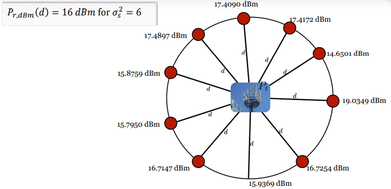 예를 들어 위 같은 환경이 있다고 가정하자. 이때 각 Rx는 $P_{r,dBm}$에 $\epsilon_{dB}$가 추가되어 17.4897dBm, 15.8759dBm등의 값을 갖게 된다. 이때 $\epsilon_{dB}$는 평균이 0이므로, 각 Rx에서의 Received power를 평균내면 $P_{r,dBm}=16$을 얻는다.