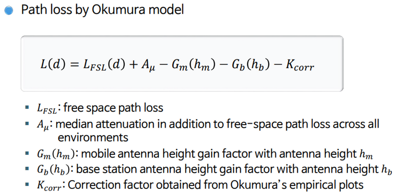Free space path loss $L_{FSL}(d)$에 attenuation 보정 값 $A_{\mu}$를 더하고, Rx antenna와 Tx antenna를 함수로 표현한 값 $G_m(h_m)$, $G_b(h_b)$를 고려해준다. 이에 더해 $K_{correction}$이라는 보정값 통신이 이루어지는 장소 (오피스, 빌딩 등)에 따라 한 번 더 추가한다.