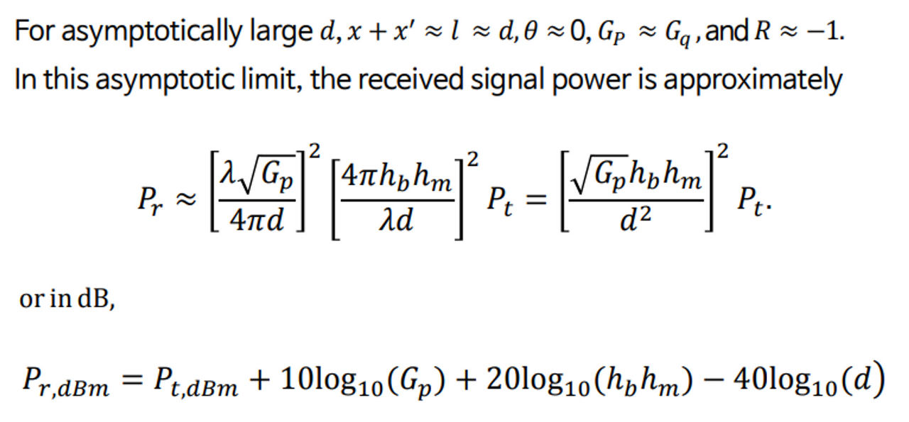 위 식에 의하여 최종적으로 Received power $P_r$은 다음처럼 얻어지며 Received power가 Transmit power에 $d^{-4}$의 비로 감소한다는 것을 알 수 있다.