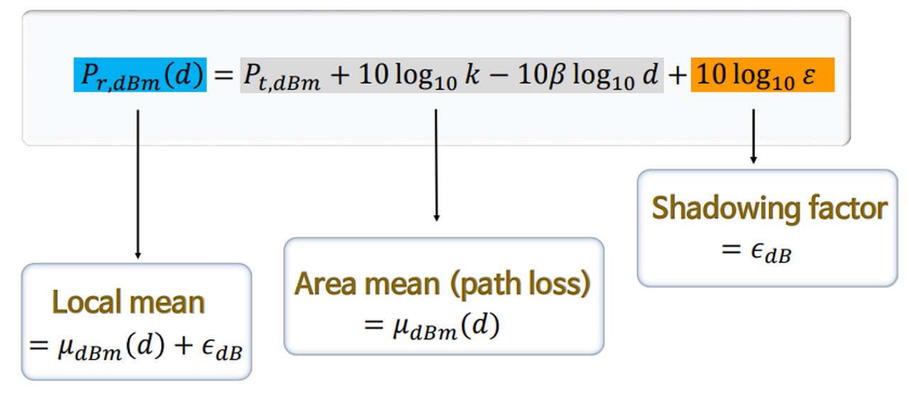 Shadowing을 고려하는 경우 위처럼 path loss만 고려한 식에 shadowing factor $\epsilon$이 추가로 곱해진다. 따라서 Received power $P_{r,dBm}$은 다음과 같이 나타난다.