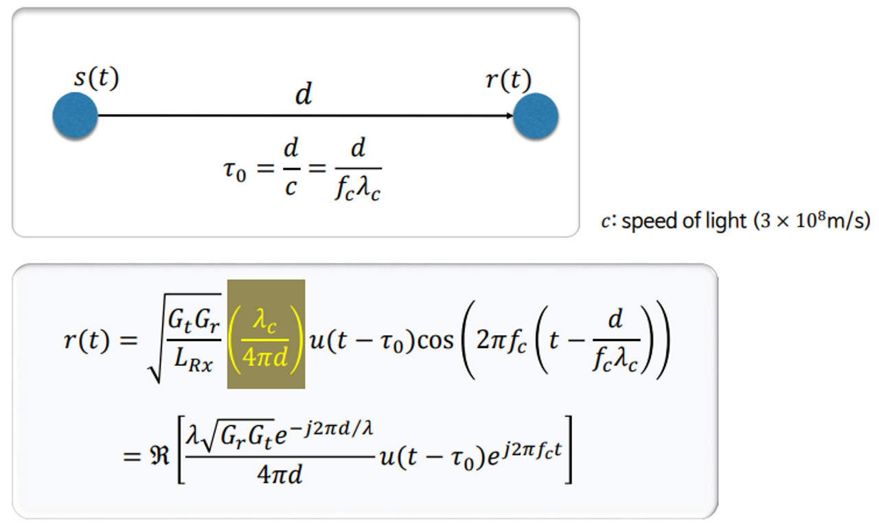 $r(t)=\sqrt{\frac{G_T G_R}{L_{rx}}} \bigg( \frac{\lambda_c}{4 \pi d} \bigg) u(t-\tau_0) \cos(2\pi f_c(t-\frac{d}{f_c \lambda_c}))$