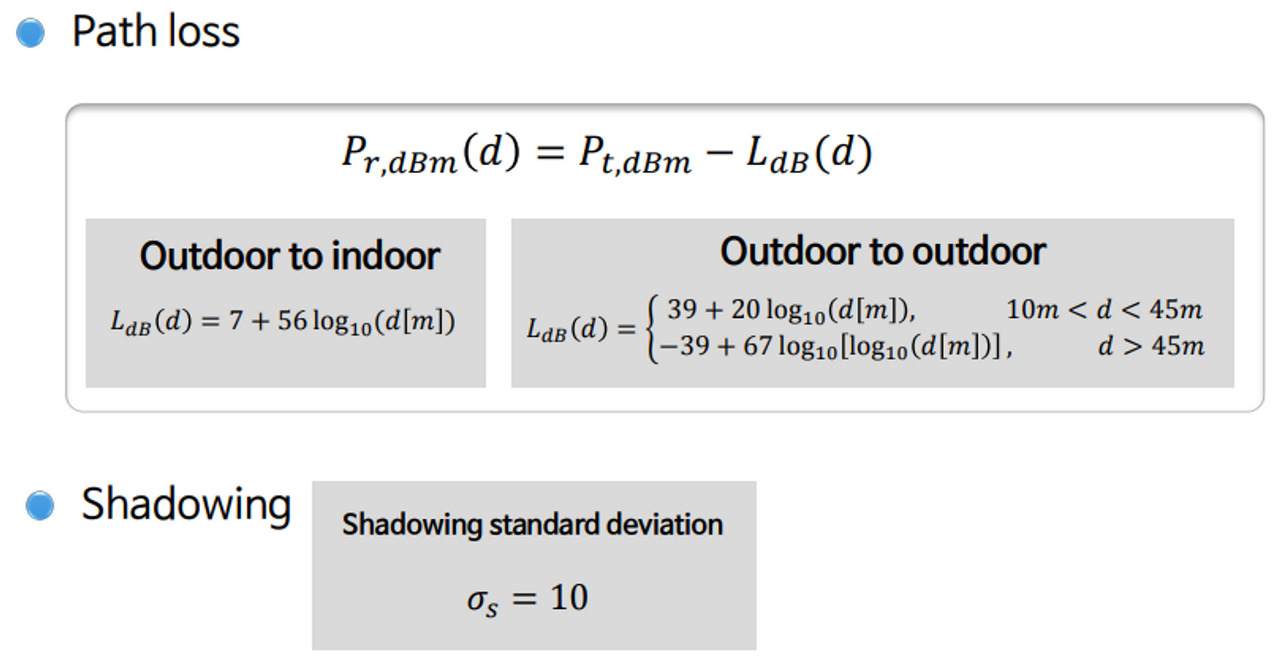 실제 4G-LTE에서 사용되는 Path loss는 위와 같다. Outdoor to indoor과 Outdoor to outdoor에서 서로 다르게 정의되는 것을 확인할 수 있다.