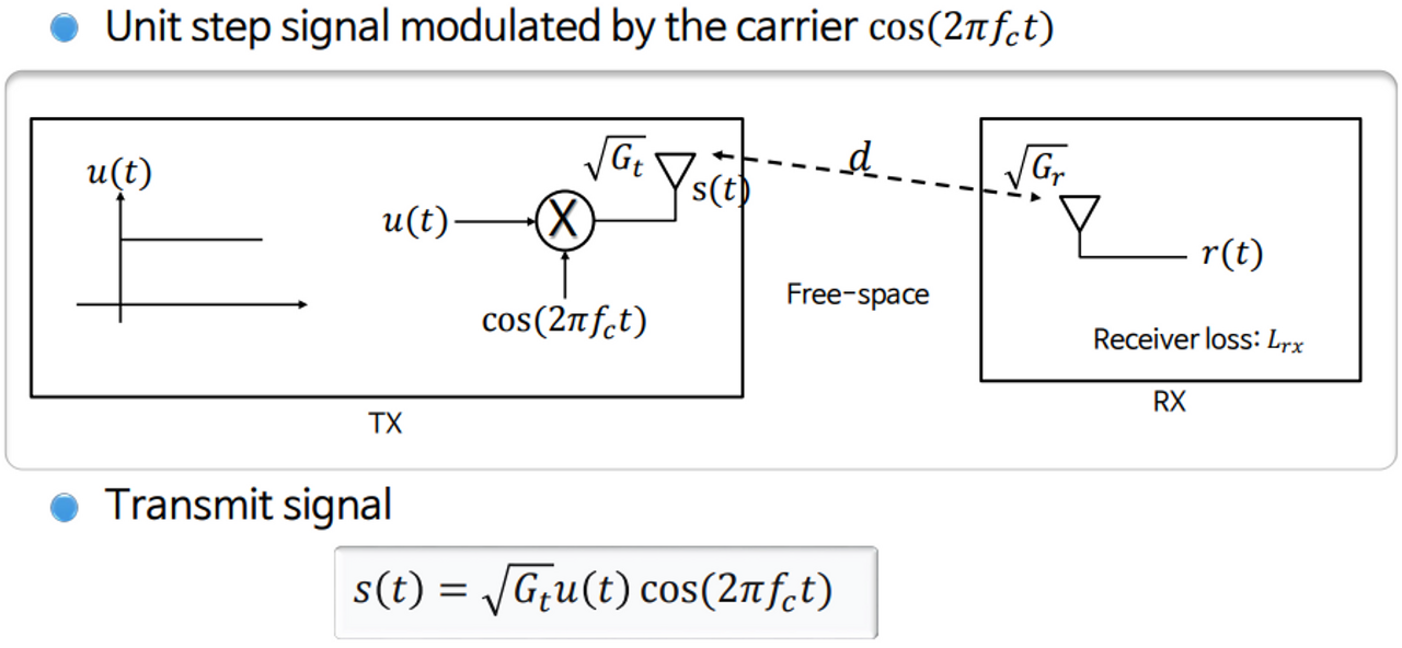 Channel에 bit를 전송할 때, 이 bit를 analog pulse $u(t)$에 실어서 전송해야 한다. 이 pulse는 RF영역에서 전송되어야 하므로 $\cos (2\pi f_c t)$를 통해 modulation을 거친다. 그 후 antenna gain $\sqrt{G_t}$이 곱해져 Rx로 전송된다.