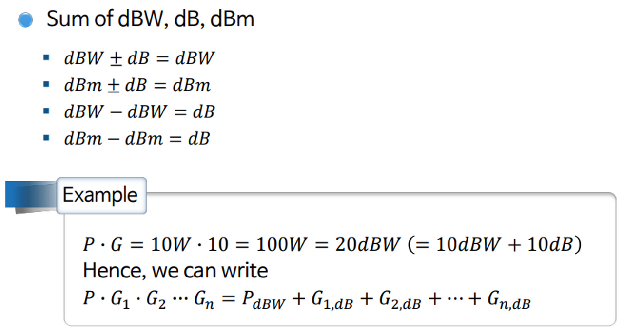 이렇듯 dBW과 dBm은 단위 안에 이미 W와 mW를 log 안에 포함하고 있기 때문에 dBW, dBm과 연산이 이루어질 수 없다. 연산을 위해서는 W, mW단위에서 연산을 마친 후 dBW으로 변환해야 한다.