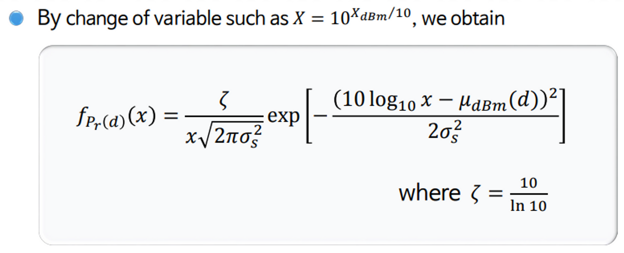 dBm 단위에서 $P_{r,dBm}(d)$의 분포가 $f_{X,dBm}(x)$일 때 Watt 단위의 PDF $f_X(x)$는 다음과 같이 얻을 수 있다.