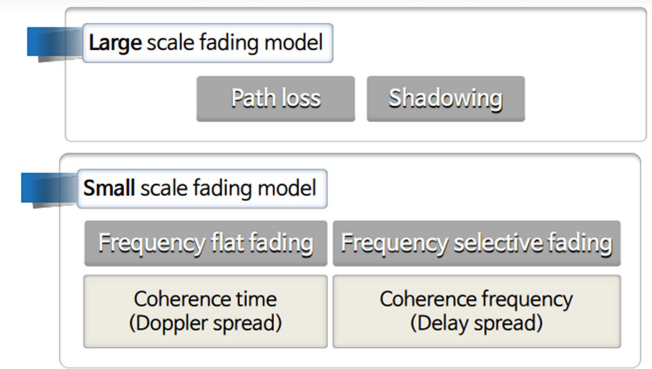 지난 강의에서는 fading의 종류를 Large, small로 분류하였다. Large scale fading은 Average power에 대한 channel model이며, small scale은 Instantaneous power에 대한 channel model이다.