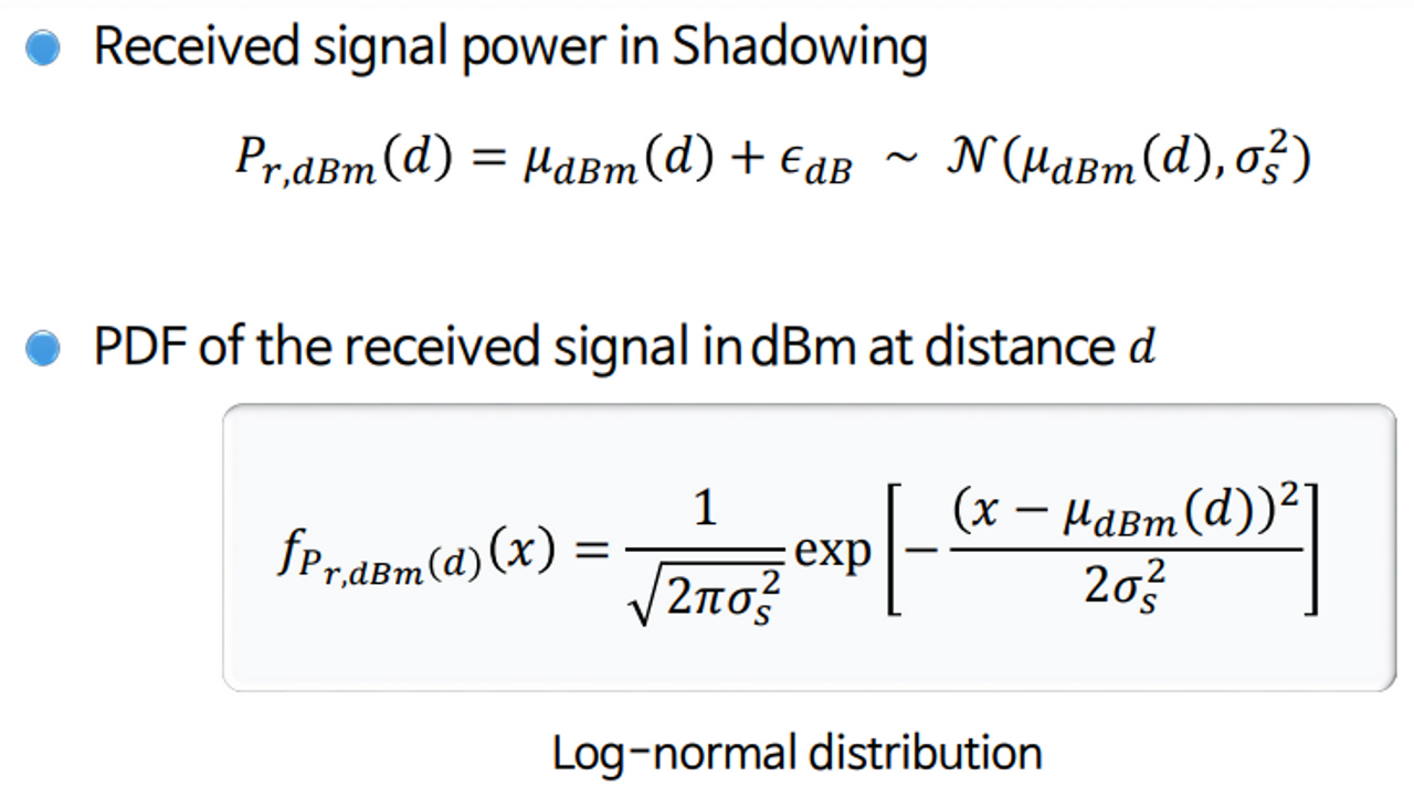 - Shadowing : Tx로부터 같은 거리에 떨어져있는 Rx간 Received power가 일정하지 않다. 또한 그 차이를 $\epsilon$이라고 하는데, epsilon값은 $N(0, \sigma_s^2)$의 gaussian distribution을 따른다.