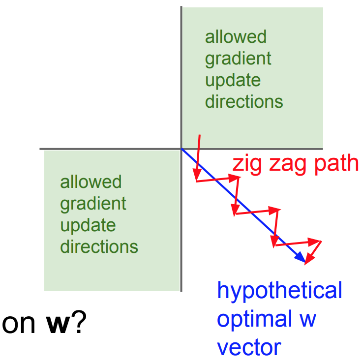 weight가 2차원인 간단한 예시에서 이를 살펴보면 위와 같다. optimal weight는 4사분면에 존재하지만 weight update는 1사분면 혹은 3사분면 방향으로만 이동이 가능하므로 270~360도 각도로는 벡터를 이동시킬 수 없다. 따라서 4사분면의 optimal point에 도달하기 위해서는 비효율적인 zig zag path를 따라 움직여야 한다.