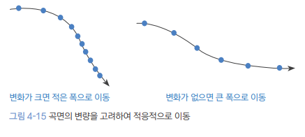 loss function의 경사가 가파를 때는 적은 폭으로 천천히 이동하고, 경사가 완만한 경우에는 큰 폭으로 빠르게 이동하는 것이 일반적으로 좋다. 이처럼 loss function의 곡면 변화를 고려하여 learning rate를 자동으로 조정하는 방식을 adaptive learning rate라고 한다.