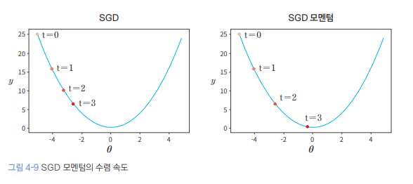 기존 SGD는 현재 위치에서의 gradient $\Delta f(\vec{x}_t)$만을 사용하여 update 한다. 하지만 SGD 모멘텀에서는 현재 속도 $\vec{v}_t$를 더하여 다음 속도벡터에 사용한다. 따라서 이 방식은 현재 이동하던 방향(속도벡터)을 $\rho$만큼 관성으로 반영한다는 의미다.