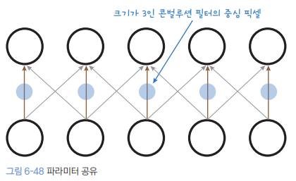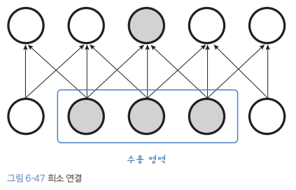 컨볼루션 필터는 입력데이터와 필터가 겹치는 영역에서만 연산이 이루어지고 나머지 부분에서는 연산을 수행하지 않는데, 이것을 희소연결이라고 부른다. 더하여 동일한 필터로 입력 데이터 전체에 대해 연산이 수행되므로 한 계층의 뉴런은 파라미터를 공유한다. 쉽게 말하면 사진 내에 사람 얼굴이 어느 위치에 존재하던 간에 컨볼루션 필터는 사람 얼굴을 추출해낼 수 있다.