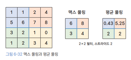 가장 많이 사용되는 두 풀링의 예시이다. 2x2 pooling을 수행하면 이미지의 가로, 세로크기가 각각 절반으로 줄어든다. max pooling은 2x2 영역에 대하여 가장 큰 값을 추출하고, average pooling은 해당 영역의 평균값을 추출한다. 따라서 max pooling은 이미지의 크기를 줄임과 동시에 두드러지는 특성을 추출한다고 볼 수 있고, average pooling은 이미지 크기를 줄이면서 이미지의 전반적인 특징을 반영한다고 볼 수 있다.