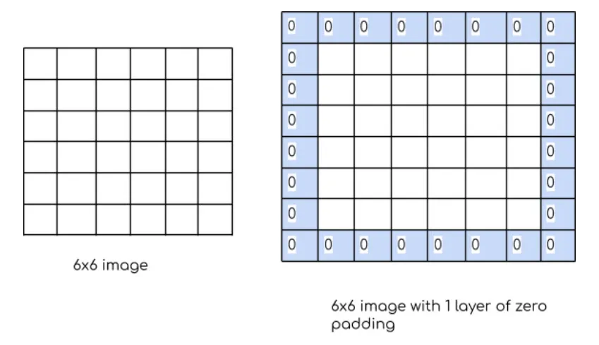 따라서 컨볼루션 연산을 더 많이 수행하기 위해서는 이미지 크기를 어느정도 유지해야 할 필요가 있으며, 우리는 이를 위해 Padding 기법을 사용한다. Padding은 이미지 데두리에 지정된 만큼의 픽셀을 추가하여 컨볼루션 연산 후에도 이미지 크기가 유지되도록 한다.