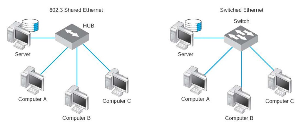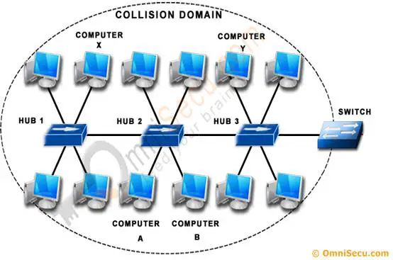 왼쪽의 허브의 경우는 Computer A가 B와 통신하는 경우 C는 D와 (또 다른 컴퓨터 D가 있다고 치자) 통신 할 수 없다. Hub에 연결된 모든 PC들은 같은 Collision domain에 있기 때문에 어느 한 곳에서 통신이 발생하면 나머지들은 기다려야 한다.