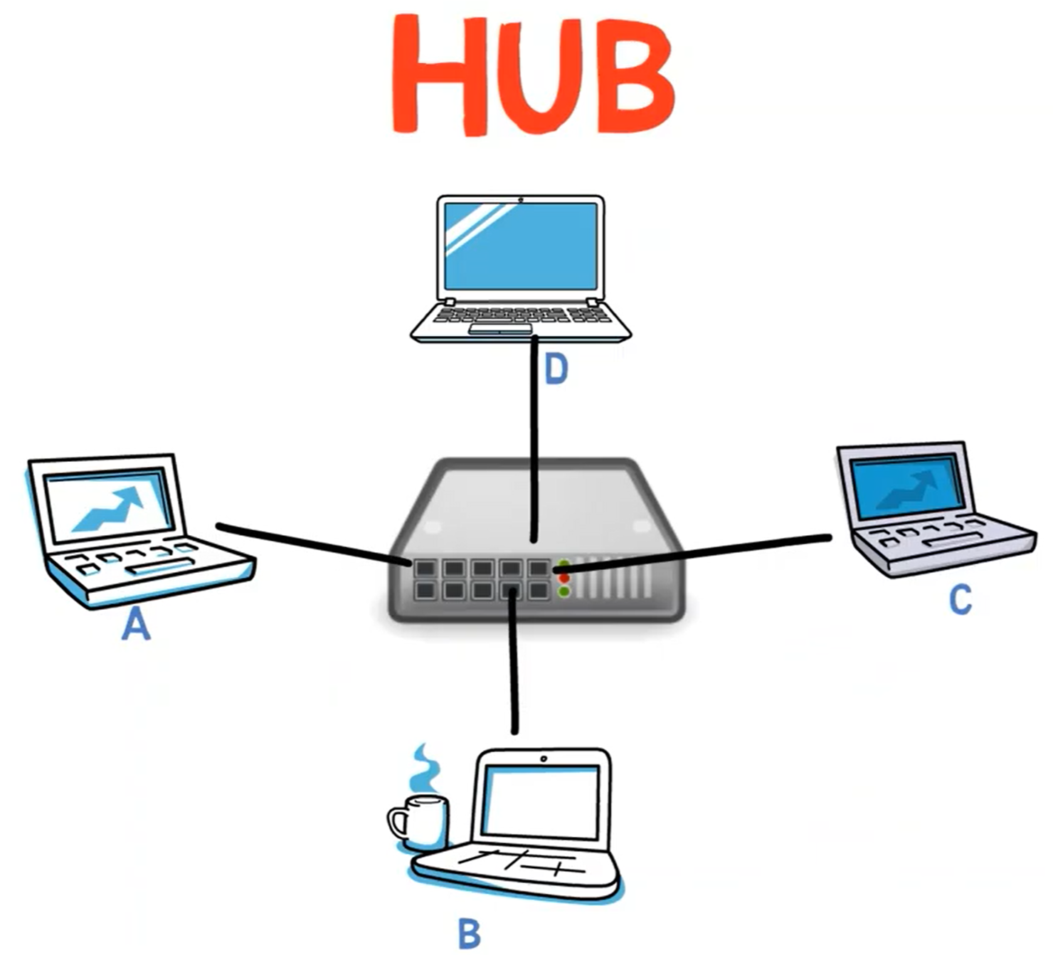 - 허브에서 A를 제외한 모든 디바이스에 데이터를 뿌린다.