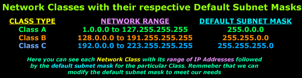 예를 들어 class B 네트워크 150.150.0.0을 서브네팅 한다면 서브넷 마스크는 255.255.0.0에서 255.255.255.0이 되고, 150.150.1.0, 150.150.2.0 ... 으로 네트워크를 세분화 할 수 있다. 각 서브넷은 서로 다른 network가 되었으므로 서브넷 간 통신은 router를 이용하여야 한다.