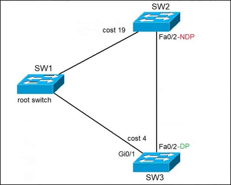 - SW2, SW3을 잇는 segment의 두 port를 비교해본다. 이때 SW3의 오른쪽 port → Root는 cost 4이고, SW2는 cost 19이므로 SW3의 오른쪽 port가 designated port로 선정된다.