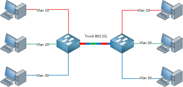 위처럼 VLAN 스위치가 각각 10, 20, 30이라는 네트워크 세 개를 담당하고 있다고 하자. 이때 두 스위치를 Trunk port 하나를 이용하여 연결해주면, 각 network끼리 하나의 경로만을 통해 연결이 가능하다. (서로 다른 network 간 통신은 불가능하다.) 즉 Trunk를 거쳐 왼쪽 스위치의 VLAN 10, 오른쪽 스위치의 VLAN 10 간의 통신이 가능한 것이다.