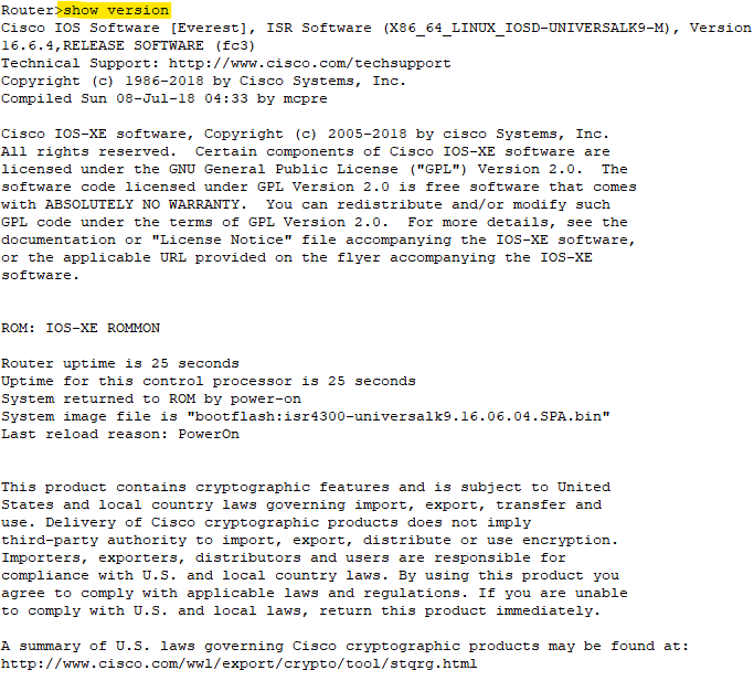 먼저 라우터의 기본적인 내용들 ex) SW version, interface 종류 등 전반적인 내용을 알기 위해서 명령어 show version을 입력한다.