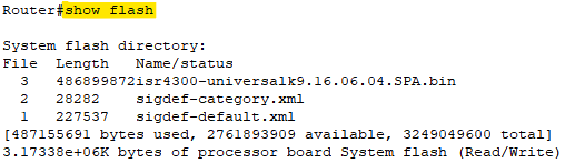 담겨있는 파일 3개가 IOS에 대한 정보이며, Flash memory의 총 메모리, 그리고 사용한 메모리는 얼마인지 알 수 있다.
