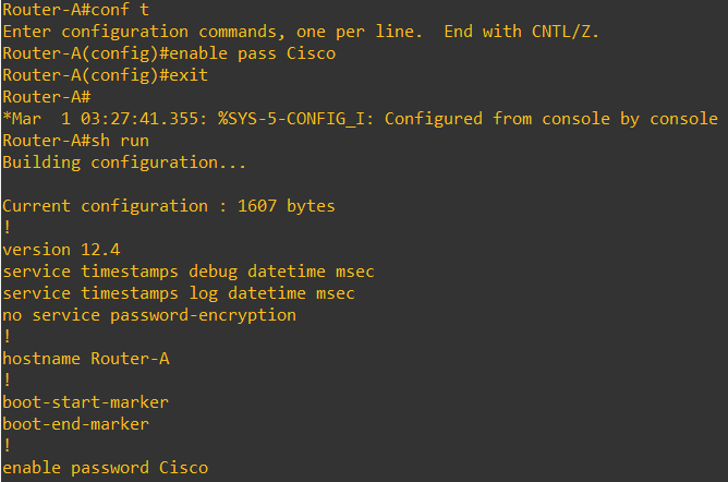 맨 위에서 enable pass Cisco를 통해 enable password를 Cisco로 설정하였다. 그 이후 sh run을 이용하여 현재 configuration을 확인해보면 enable password Cisco를 통해 설정된 password를 그대로 보여준다.