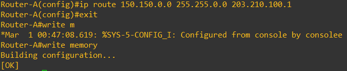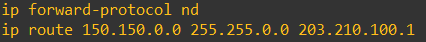 - ip default-network 뒤에 오는 네트워크 주소는 항상 class에 맞추어 설정해야 한다. 예를 들어 150.100.10.0라고 입력하는 것은 불가능하다. 150으로 시작하는 IP는 B class이기 때문에 2옥텟만 네트워크이다. 따라서 150.100.0.0을 입력해야 한다.