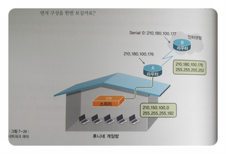 PC방에서 일반적으로 사용되는 구성을 예로 들어보자. 이더넷쪽 subnet mask는 255.255.255.192로 네트워크 부분이 굉장히 길다 : 일반적으로 호스트를 많이 부여하지 않는다.
