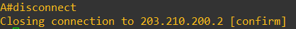 disconnect 명령어를 입력하면 가장 최근에 접속했던 telnet (*표시가 되어있는 것)의 연결을 끊는다. disconnect 2 처럼 특정 번호의 telnet을 지정해서 연결을 끊을 수도 있다.