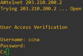 Router A ➜ C로 telnet 연결을 해보았다. Router C는 telnet 설정에서 login local을 이용하여 username, password 두 개를 설정했기 때문에 이 두 값을 전부 입력해야 C의 telnet session으로 진입할 수 있다.