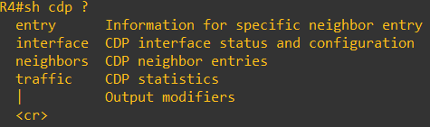 show cdp ?를 입력하면 CDP 뒤에 올 수 있는 옵션들을 알려준다. 먼저 show cdp를 통해 일반적인 CDP 상황을 살펴본다.